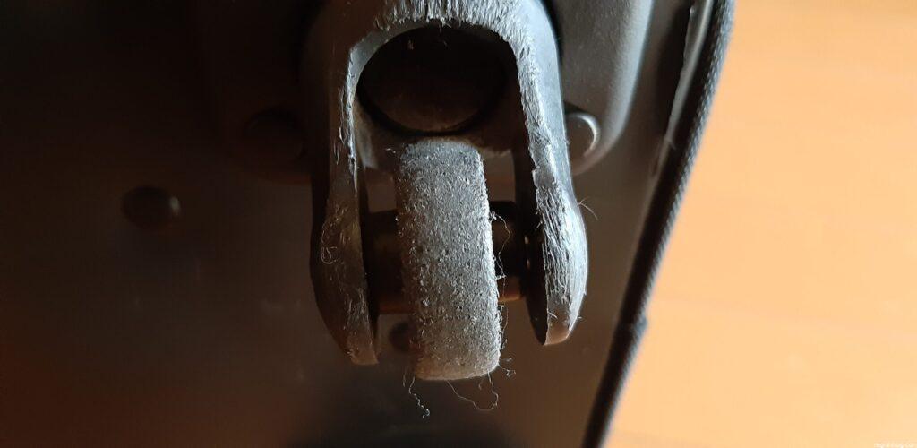 キャリーバッグの外観上はパッと見では破損がわかりませんが、キャスターを見ると1輪だけタイヤが剥がれてホイールだけになっているのがわかります。
