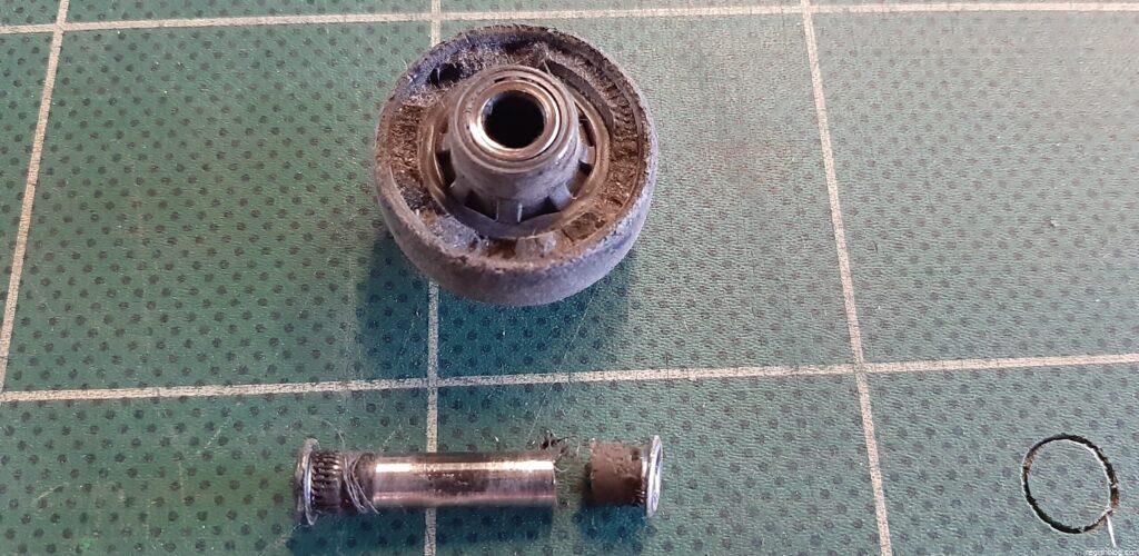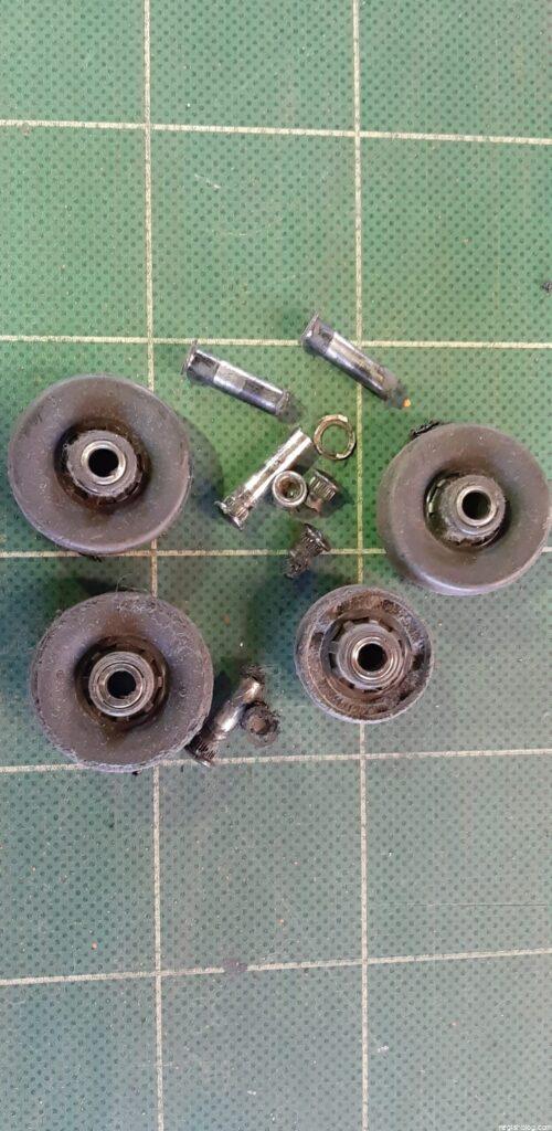 もう1輪も負荷が掛からないキャスターとの差異は外径で2mm程度ありましたので、非常に磨耗が進んだ状態でいつタイヤのゴムが剥がれてもおかしくない状態でした。